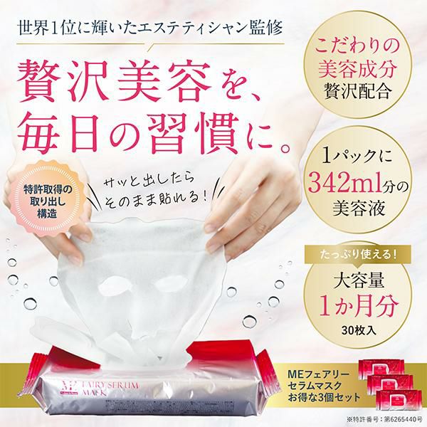 他の画像を見る ME フェアリーセラムマスク(30枚入り×3個セット) エステティシャン監修 美容液 大容量パック 浸透しやすい 角質層まで 正規品 ギフト可 日付指定可 送料無料 10%OFF セール価格 ¥ 7,980 税込 カートに入れる お気に入りに登録する