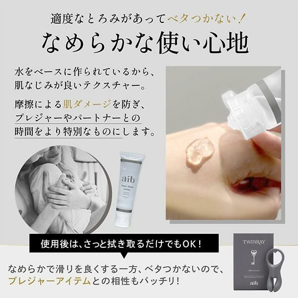 フェムテックジャパンアワード2024審査員特別賞を受賞したaibから、男性向けの新提案!ただの潤滑ローションじゃない!男性の悩みをサポートするアルギニン(※1)、シトルリン(※2)配合で、パートナーとの関係をワンランクアップ。さらに、年齢とともに失われがちな肌のハリや弾力をケアするヒト脂肪間質細胞エクソソーム(※3)、ローヤルゼリーエキス(※4)も贅沢に配合し、エイジングケア(※5)まで。水がベースなのでベタつかず、使用後は拭き取りのみでもOK!女性の悦びを知り尽くしたaib渾身の一品だから、女子ウケもバッチリ!男性はもちろん、「パートナーと楽しみたい」「喜ばせたい」という女性からもご注文いただいています。
