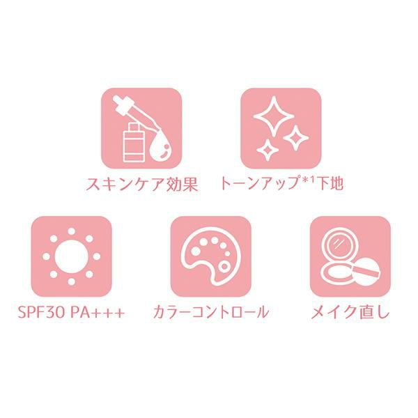 スキンケア発想で外的刺激から肌を守り、毛穴レス(*1)に整えるトーンアップ(*1)UV下地。SPF30/PA+++、アルコールFREE、パラベンFREE、ミネラルオイルFREE、合成着色料FREE、合成香料FREE。スキンケア成分67.2%配合。【うるおい】ジューシー果実美容液(*2)【肌荒れ防止】CICA(*3)【ハリ・ツヤ】コラーゲン(*4)微香性。