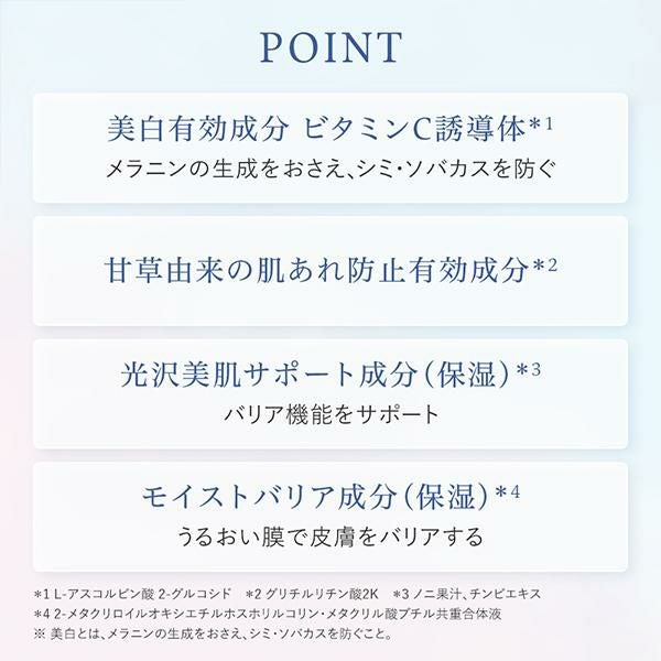 ●【2つの薬用有効成分+光沢美肌サポート成分配合】角層のすみずみに2つの薬用有効成分*2*3と独自の皮膚科学研究に基づく光沢美肌サポート成分*4がスッと浸透。キメふっくら、ハリと透明感あふれる素肌へ導きます。(*2 L-アスコルビン酸 2-グルコシド、*3 グリチルリチン酸2K、*4 ノニ果汁、チンピエキス)