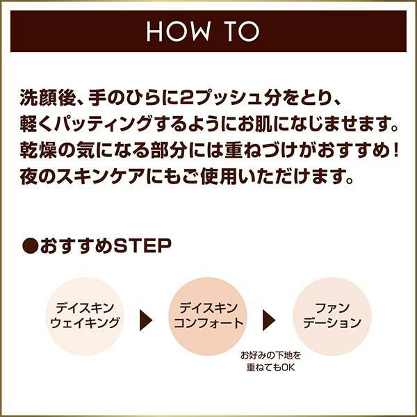 洗顔後、手のひらに2プッシュ分をとり、軽くパッティングするようにお肌になじませてください。乾燥の気になる部分には重ねづけをおすすめします。