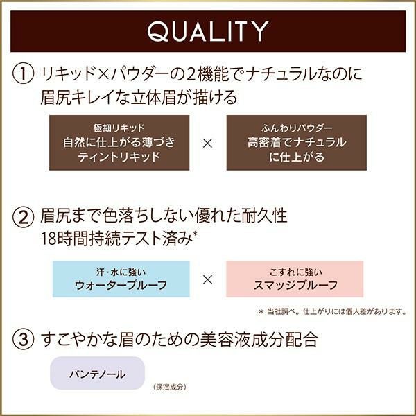 極細リキッド×ふんわりパウダーで立体眉。夜まで落ちないウォータープルーフアイブロウ。リキッド×パウダーの2機能でナチュラルなのに眉尻キレイな立体眉が描ける。