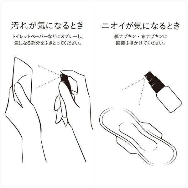 トイレットペーパーなどにスプレーし、デリケートゾーンの気になる部分を拭き取って使用してください。