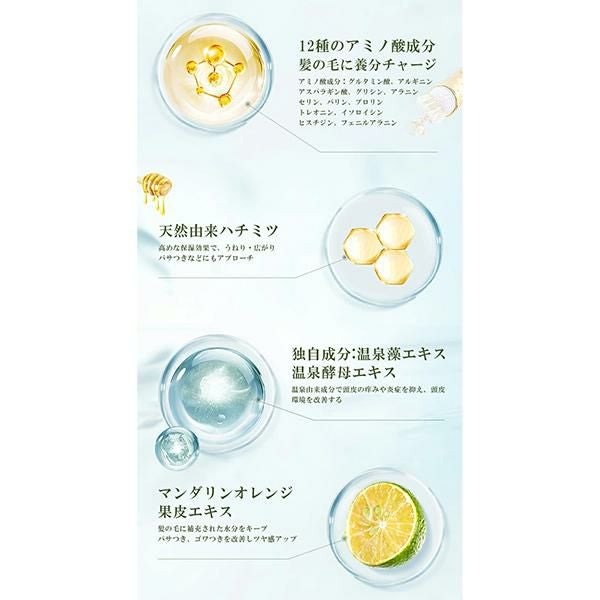 温泉藻エキスと温泉酵母エキスを配合し、髪と頭皮にうるおいと艶を与える保湿トリートメントです。