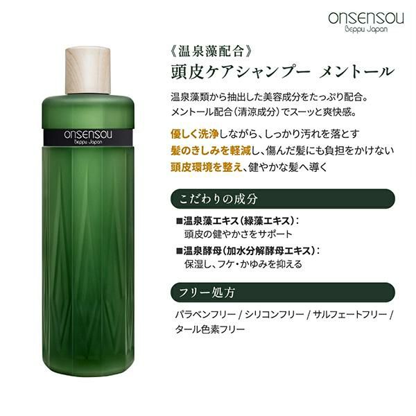 温泉藻エキスと温泉酵母エキスのW配合で、フケ・かゆみを防ぎながら頭皮をすこやかに整えます。