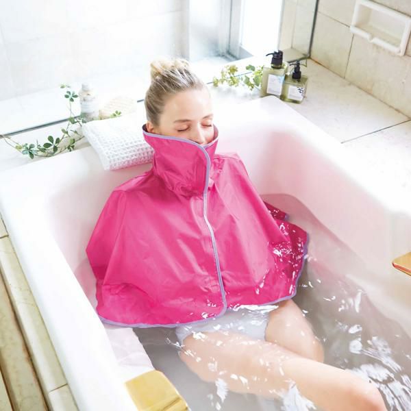 二の腕までカバーして上半身をすっぽり保温し、半身浴中の冷えをしっかりガード。裾が湯船につかるロング丈。