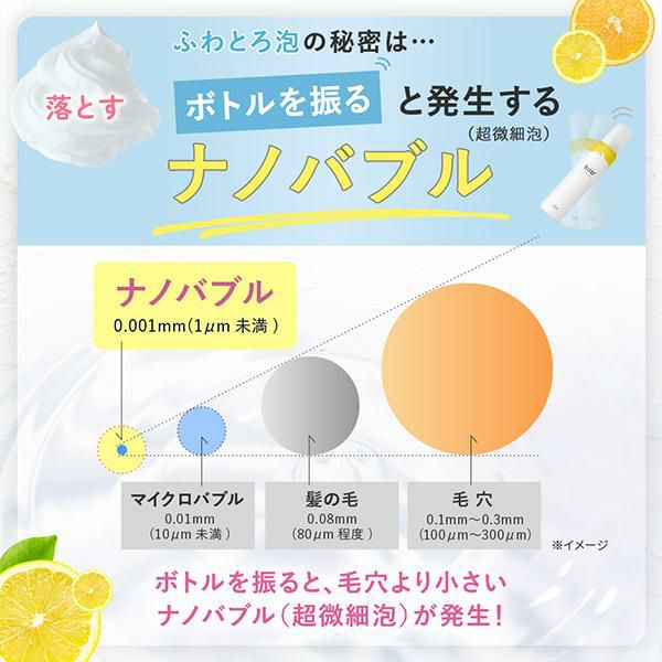 ナノボールの入ったボトルをよく振ると、毛穴よりはるかに小さい直径1μm(マイクロメートル)以下の超微細なナノバブルが発生。約6800ppmの炭酸※1×ナノバブルで、毛穴の奥の汚れまで浮かせて落とし、素肌の透明感※2を引き出します。