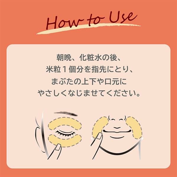 朝晩の化粧水の後、米粒1個分を指先にとり、まぶたの上下や口元にやさしくなじませてください。
