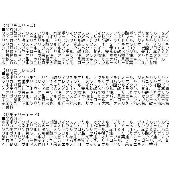 水添ポリイソブテン、リンゴ酸ジイソステアリル、オクチルドデカノール、ジメチルシリル化シリカ、水添ポリ(C6-14オレフィン)、ホホバ種子油、1,2-ヘキサンジオール、イソステアリン酸ソルビタン、メントキシプロパンジオール、バニリルブチル、赤202、赤104(1)、酸化チタン、安息香酸ベンジル、黄5、青1、アルガニアスピノサ核油、シア脂、ツバキ種子油、トリ(カプリル酸/カプリン酸)グリセリル、月見草油、オリーブ果実油、アーモンド油、アンズ核油、カニナバラ果実エキス、マンゴー果実エキス、リナロール、トコフェロール、水、BG、プルヌスセロチナ果実エキス、ローブッシュブルーベリー果実エキス、香料