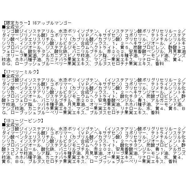 水添ポリイソブテン、リンゴ酸ジイソステアリル、オクチルドデカノール、ジメチルシリル化シリカ、水添ポリ(C6-14オレフィン)、ホホバ種子油、1,2-ヘキサンジオール、イソステアリン酸ソルビタン、メントキシプロパンジオール、黄4、赤104(1)、バニリルブチル、安息香酸ベンジル、赤202、シア脂、ツバキ種子油、トリ(カプリル酸/カプリン酸)グリセリル、アルガニアスピノサ核油、月見草油、オリーブ果実油、アーモンド油、アンズ核油、カニナバラ果実エキス、マンゴー果実エキス、青1、リナロール、トコフェロール、水、BG、プルヌスセロチナ果実エキス、ローブッシュブルーベリー果実エキス、香料