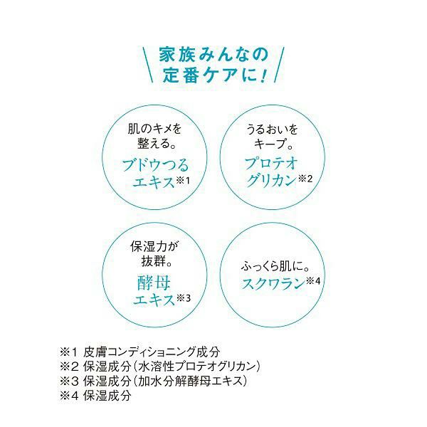 ハリを与えるプロテオグリカン*1や肌のキメを整え、みずみずしさを与えるブドウつるエキス*2など配合で、うるおいをサポートし、しっとりふっくら肌に。