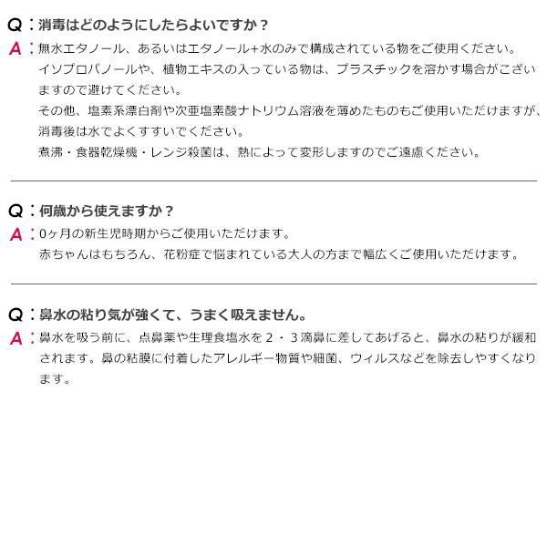 A:鼻水を吸う前に、点鼻薬や生理食塩水を2・3滴鼻に差してあげると、鼻水の粘りが緩和されます。