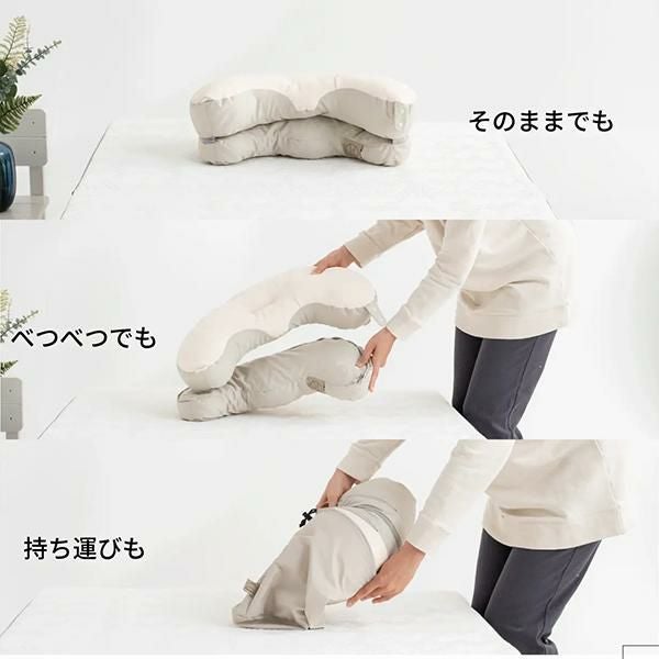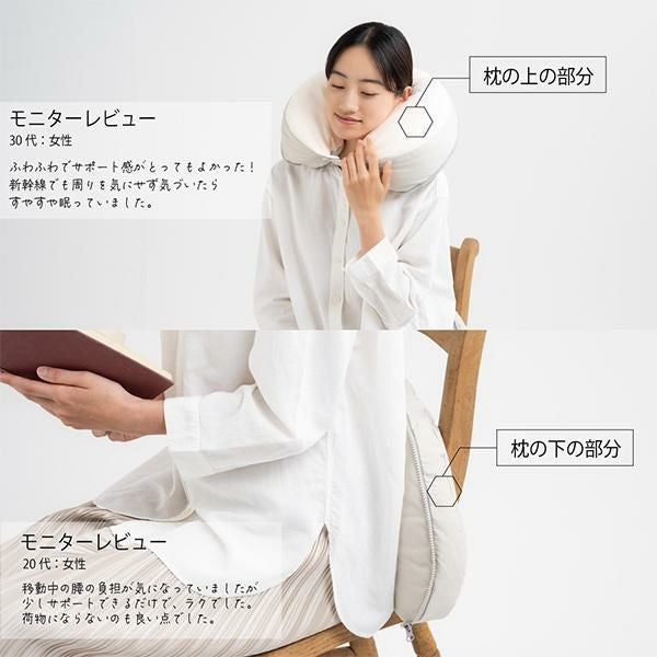 ファスナーを開けると上部はネックピローとして、下部は背当てクッションとしても使えます。