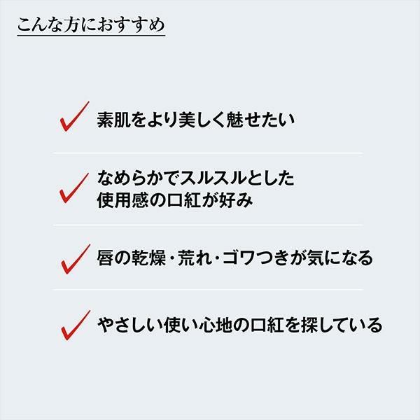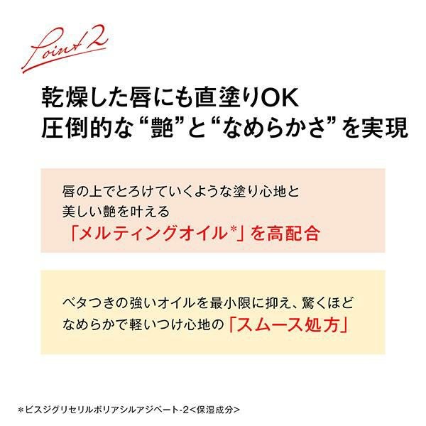 乾燥した唇にも直塗りできるほどのなめらかな塗り心地とスキンケア機能で、塗るほどにうるおって、ふっくら艶めく唇へ*1。とろけて艶めく「メルティングオイル*2」を高配合し、唇の上でとろけていくような塗り心地と圧倒的な艶を叶えました。約86%がうるおい成分で、唇の乾燥や荒れを防ぐ成分を厳選。合成色素不使用のミネラルカラー設計。
