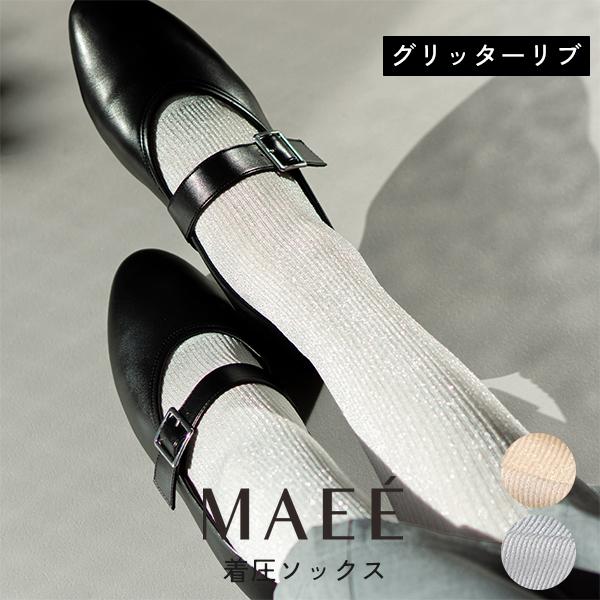 マエエ コンプレッションソックス グリッターリブ 着圧ソックス 極柔ラメ糸 チクチクしにくい なめらか リブ編み 細リブ 段階着圧 MAEE 正規品 メール便1通2個まで可 ギフト可