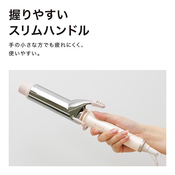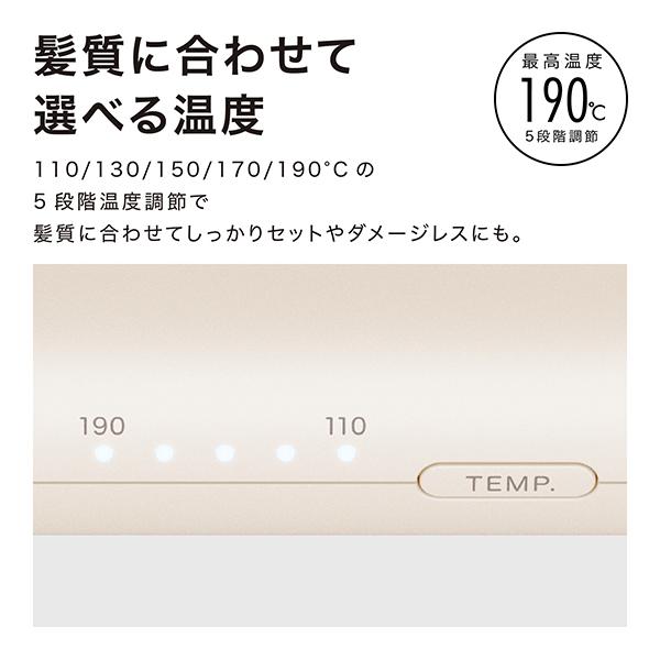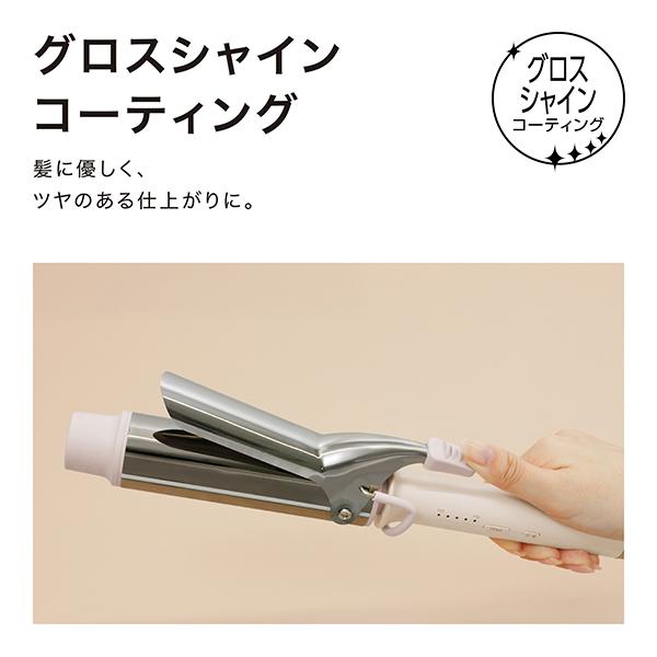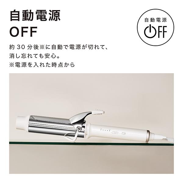 40mmの大きめサイズで、トレンドの韓国風ヘアスタイルなどの太巻きアレンジが簡単に作れます。先端は凹凸のないクールチップのデザインを採用。熱くなりづらく、スタイリングの支えとしても便利です。シリコンのカーリングリブが髪をしっかり固定し、軽い力でくるっとセットが可能です。温度設定も110~190℃の5段階。髪質に合わせて設定可能。100℃までの立ち上がり30秒。自動温度ロック機能付きで仕様ちゅうの誤作動がありません。
