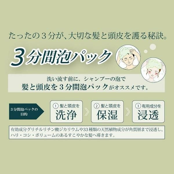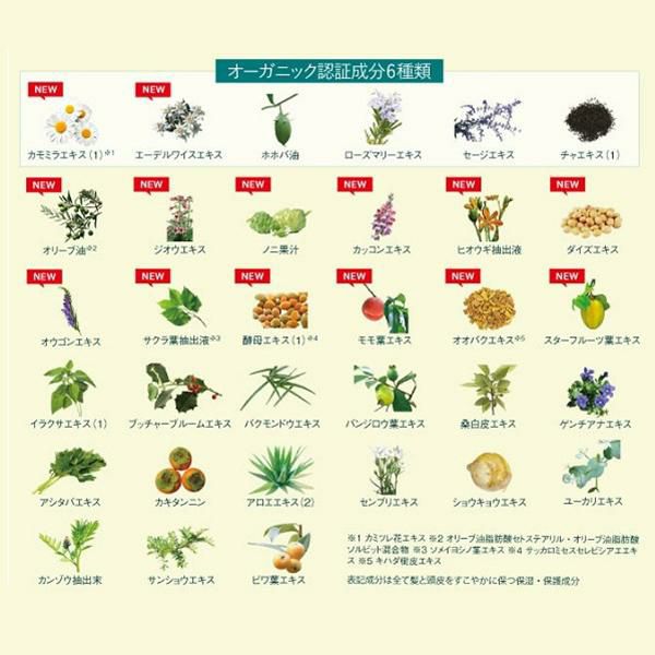 ■その他の成分/イラクサエキス(1)、ブッチャーブルームエキス、バクモンドウエキス、ロート油、オリーブ油脂肪酸セトステアリル・オリーブ油脂肪酸ソルビット混合物、バンジロウ葉エキス、桑白皮エキス、ゲンチアナエキス、アシタバエキス、カキタンニン、ホホバ油、アロエエキス(2)、センブリエキス、ショウキョウエキス、ジオウエキス、ローズマリーエキス、セージエキス、カモミラエキス(1)、エーデルワイスエキス、チャエキス(1)、ノニ果汁、カッコンエキス、ヒオウギ抽出液、ダイズエキス、オウゴンエキス、サクラ葉抽出液、酵母エキス(1)、モモ葉エキス、オオバクエキス、スターフルーツ葉エキス、ユーカリエキス、カンゾウ抽出末、サンショウエキス、ビワ葉エキス、ヤシ油、ヤシ油脂肪酸モノエタノールアミド、モノラウリン酸ポリグリセリル、ラウロイルメチル-β-アラニンナトリウム液、テトラデセンスルホン酸ナトリウム液、濃グリセリン、グリセリン、N-ヤシ油脂肪酸アシル-L-グルタミン酸トリエタノールアミン液、塩化O-[2-ヒドロキシ-3-(トリメチルアンモニオ)プロピル]ヒドロキシエチルセルロース、ヤシ油脂肪酸アミドプロピルベタイン液、γ-グルタミン酸ポリペプチド、N-ヤシ油脂肪酸アシル-L-アルギニンエチル・DL-ピロリドンカルボン酸塩、アルキル(8~16)グルコシド、加水分解ケラチン液、香料、サクシニルカルボキシメチルキトサン液、1,2-ヘキサンジオール、1,3-ブチレングリコール、N-ラウロイル-L-グルタミン酸ジ(フィトステリル・2-オクチドデシル)、ブドウ糖、グリセリンモノ2-エチルへキシルエーテル、水素添加大豆リン脂質、銅クロロフィリンナトリウム、ジステアリン酸エチレングリコール、塩化ナトリウム、クエン酸、クエン酸ナトリウム、グリシン、硫酸亜鉛、メタリン酸ナトリウム、フェノキシエタノール、無水エタノール、エタノール