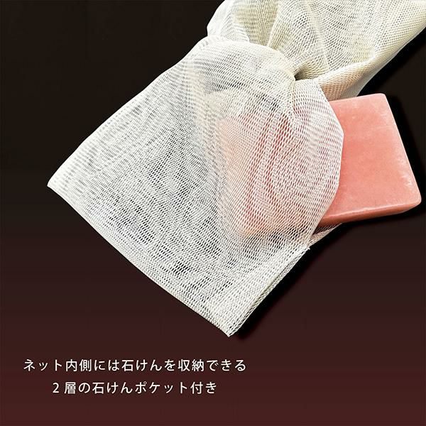 やさしい力ですばやく泡立つ、大きめサイズの「泡立てネット」。せっけん収納付きで固形石鹸派にも対応。