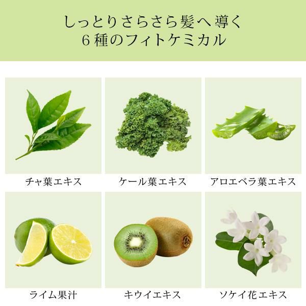 水、ジメチコン、セタノール、ステアリルアルコール、ベヘントリモニウムクロリド、ステアルトリモニウムクロリド、ソルビトール、加水分解エンドウタンパク、加水分解トウモロコシタンパク、加水分解コメタンパク、ワサビノキ種子エキス、加水分解酵母タンパク、リンゴ果実培養細胞エキス、チャ葉エキス、ケール葉エキス、アロエベラ葉エキス、ライム果汁、キウイエキス、ソケイ花エキス、イソプロパノール、パルミチン酸イソプロピル、イソペンチルジオール、ヒドロキシエチルセルロース、EDTA-2Na、クエン酸Na、アモジメチコン、PEG-200水添ヒマシ油、オキシベンゾン-5、(アクリル酸アミドプロピルトリモニウムクロリド/アクリル酸アミド)コポリマー、ポリクオタニウムー50、ラウロイルグルタミン酸ジ(フィトステリル/オクチルドデシル)、クエン酸、カラメル、グリセリン、BG、カプリリルグリコール、ジラウロイルグルタミン酸リシンNa、マルトデキストリン、エタノール、ペンチレングリコール、ステアラミドプロピルジメチルアミン、レシチン、キサンタンガム、安息香酸Na、フェノキシエタノール、ソルビン酸K、メチルパラベン、香料、黄4、緑3