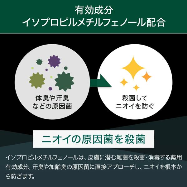 有効成分がニオイの原因となる菌を殺菌し、体臭を軽減。ニオイの原因となる菌の活動を抑制することで、体臭を間接的に軽減します。特に汗臭や加齢臭の軽減に効果が期待できます。