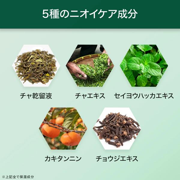 ■その他の成分/精製精製水、ラウリン酸、ミリスチン酸、水酸化カリウム、ラウリルジメチルアミノ酢酸ベタイン、ラウリン酸ジエタノールアミド、濃グリセリン、グリセリン脂肪酸エステル、チャエキス(1)、カキタンニン、チャ乾留液、シャクヤクエキス、オリーブ葉エキス、ビワ葉エキス、クワエキス、セイヨウハッカエキス、オウゴンエキス、ウコンエキス、カワラヨモギエキス、アロエエキス(2)、ゲットウ葉エキス、チョウジエキス、ホホバ油、シア脂、DL‐ピロリドンカルボン酸ナトリウム液、L‐アルギニン、グリシン、L‐アスパラギン酸、L‐ピロリドンカルボン酸、L‐アラニン、L‐セリン、L‐バリン、L‐イソロイシン、L‐スレオニン、L‐プロリン、サクシニルアテロコラーゲン液、L‐ヒスチジン、L‐フェニルアラニン、グリチルリチン酸ジカリウム、ステアリン酸、乳酸ナトリウム液、硫酸亜鉛、ヒドロキシプロピルメチルセルロース、ヤシ油脂肪酸ジエタノールアミド、N‐ヤシ油脂肪酸アシルグリシンナトリウム、モノラウリン酸ポリオキシエチレンソルビタン(20E.O.)、モノラウリン酸ポリグリセリル、1、3‐ブチレングリコール、無水クエン酸、クエン酸ナトリウム、水酸化ナトリウム、無水エタノール、香料有効成分がニオイの原因となる菌を殺菌し、体臭を軽減。