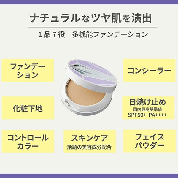 化粧下地、コントロールカラー、コンシーラー、ファンデーション、フェイスパウダー、日焼け止め、スキンケアの1品7役で、これ1つでベースメイクが完了。