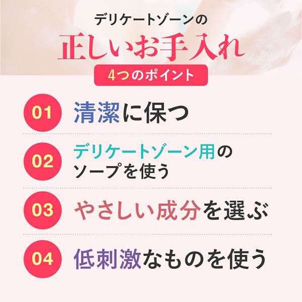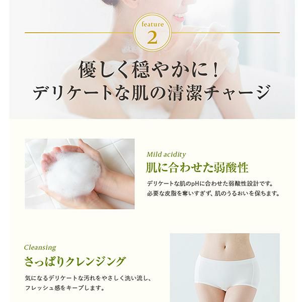 デリケートゾーンに合わせた弱酸性設計に加え、くすみ※2 の原因を防ぐ成分ナイアシンアミド、グリセリンを配合。女性のデリケートな肌の古い角質や汚れによるくすみを洗い流し、うるおいのある肌へ導きます。