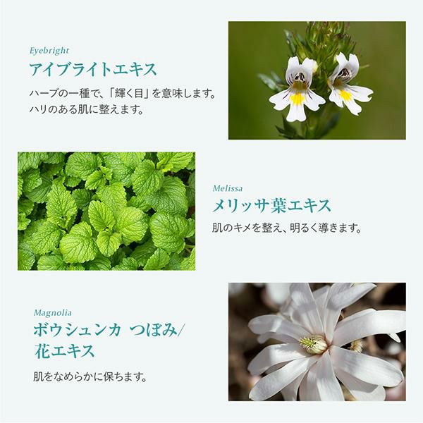 水、グリセリン、トリ(カプリル酸/カプリン酸)グリセリル、セタノール、PG(アクリロイルジメチルタウリンアンモニウム/メタクリル酸ベヘネス-25)、クロスポリマー、フェノキシエタノール、エチルヘキシルグリセリン、香料、BG、レチシン、酢酸トコフェロール、アイブライトエキス、ボウシュンカつぼみ/花エキス、メリッサ葉エキス、クエン酸、ソルビン酸K、ソルビン酸、トコフェロール、EDTA-3Na、ピロ亜硫酸Na