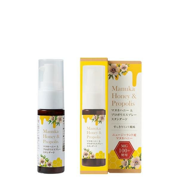ピリッと刺激のあるプロポリスと濃厚な甘みのマヌカハニーの最強タッグを組み合わせてスプレーにした携帯に便利な商品。