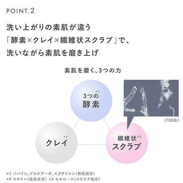 「3つの酵素*1」、「クレイ*2」、水で膨らむ「繊維状スクラブ*3」で、洗いながら素肌を磨き上げます。