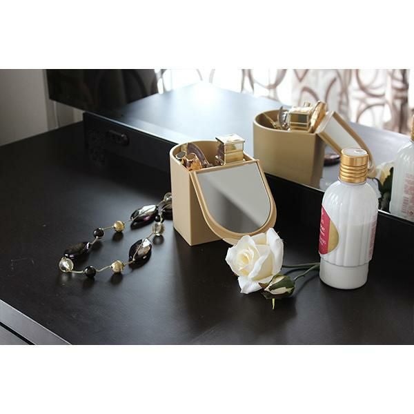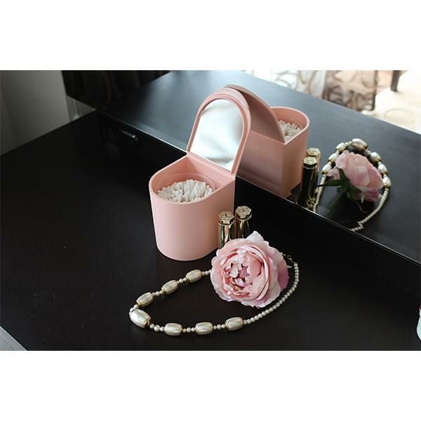 フタの裏面にはポイントメイクに便利な拡大ミラー付きで、開閉できるフタがついているのでコットンなどもホコリを防ぎ衛生的にご使用いただけます。生活感が出てしまう綿棒はケースごと収納できるのでスッキリ片付きます。軟質素材のため、家具等にキズがつきにくく、銀イオン(Ag+)配合で抗菌・消臭効果もあります。散らかりやすい小物をまとめるのにちょうどいいサイズです。