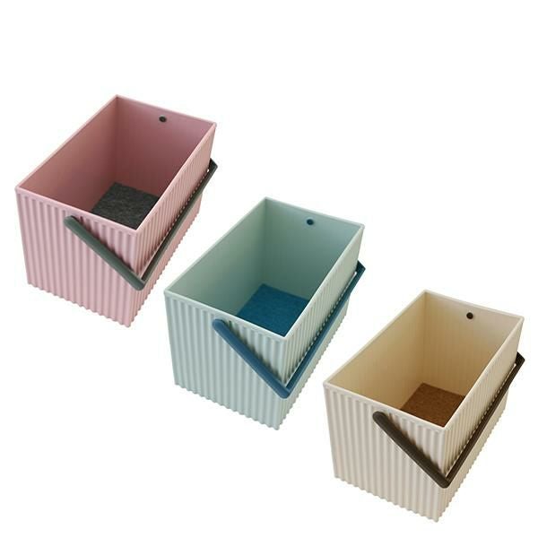 異なった3サイズをブロックのように積み重ねることができるので、用途に合わせた片付けができます。コスメやスキンケア用品などまとめて収納したり、持ち手が付いているので、使うときはボックスごと簡単に移動させることができるのも便利です。リビング以外にもキッチンで食材のストック、ダイニングで調味料入れるボックスとしてもぴったりです。家具、床などを傷つけない柔らかい素材なので安心して使用できます。