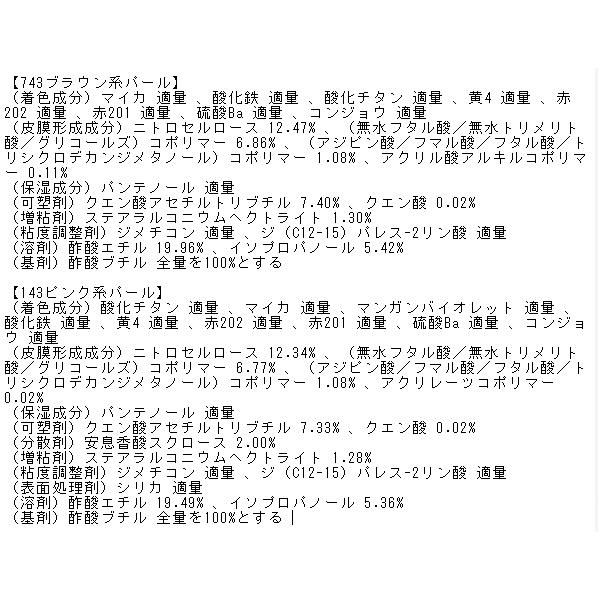 【743ブラウン系パール】【143ピンク系パール】【511レッド系】【443オレンジ系】【103ピンク系パール】【102ピンク系ラメ】【301パープル系パール】【348パープル系ラメ】の成分詳細は画像をご確認ください。