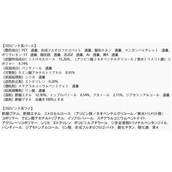 (皮膜形成成分)ニトロセルロース 12.61% 、(無水フタル酸/無水トリメリト酸/グリコールズ)コポリマー 7.08% 、(アジピン酸/フマル酸/フタル酸/トリシクロデカンジメタノール)コポリマー 1.03% 、アクリル酸アルキルコポリマー 0.09%