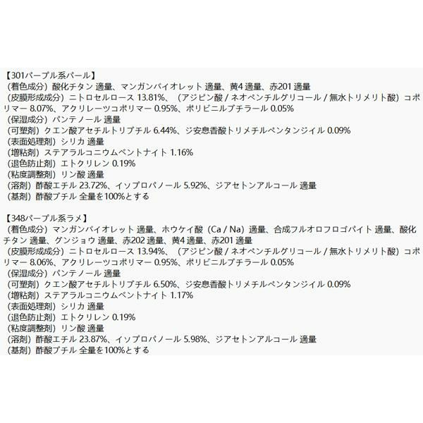 酢酸ブチル, 酢酸エチル, ニトロセルロース, (アジピン酸/ネオペンチルグリコール/無水トリメリト酸)コポリマー, クエン酸アセチルトリブチル, イソプロパノール, ステアラルコニウムベントナイト, アクリレーツコポリマー, シリカ, エトクリレン, ジ安息香酸トリメチルペンタンジイル, ポリビニルブチラール, ジアセトンアルコール, リン酸, パンテノール, マンガンバイオレット, 酸化チタン, 酸化鉄, 赤220, 赤201, 黄4