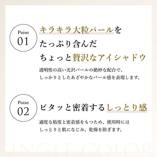 ●【選べる2タイプ】大粒な偏光パールがきらめくシアータイプと、ベースカラーが映えて目もとにインパクトを与えるカラー×パールタイプの2タイプ。なりたい印象に合わせて質感をお選びいただける単色シャドウです。