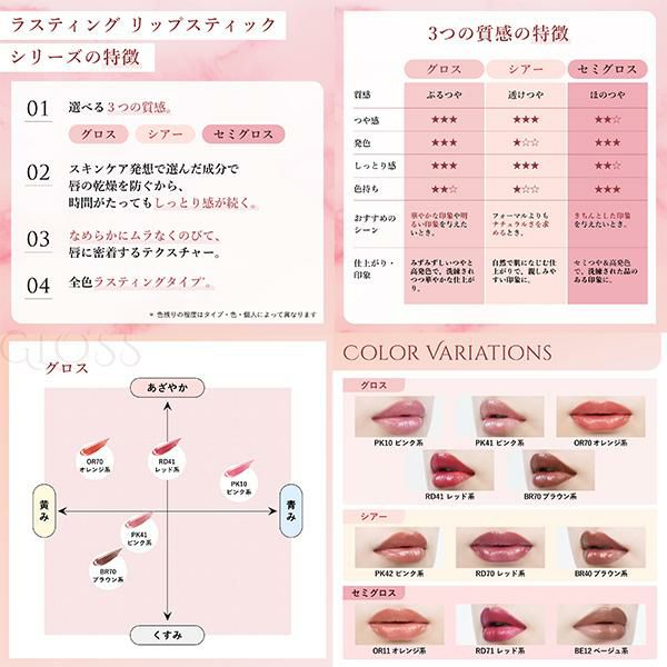 ●【選べる3つの質感があるラスティングリップスティック】グロス・シアー・セミグロスの3タイプ展開。なりたいイメージや使用シーンに合わせお選びいただけます。