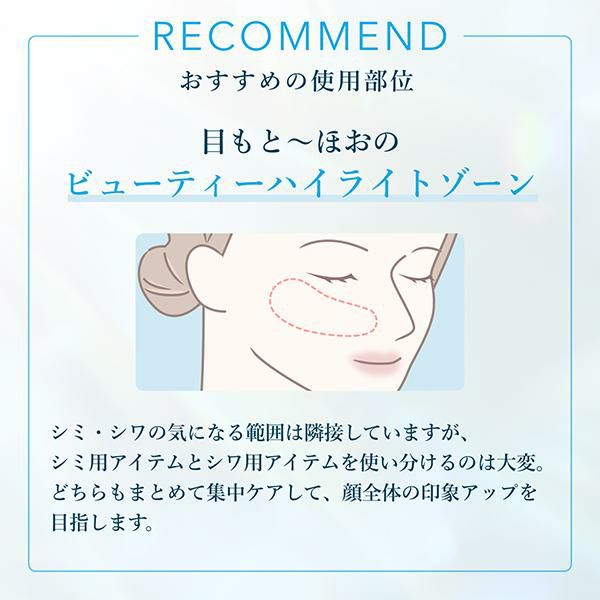 ●【目もと・ほお用】顔の印象を左右するビューティーハイライトゾーン*1を集中ケアすることで、明るい印象へ導くプラスワンアイテムです。(*1 目もとまわりとほおの高い部分を指す、顔の印象を左右する部位の総称)