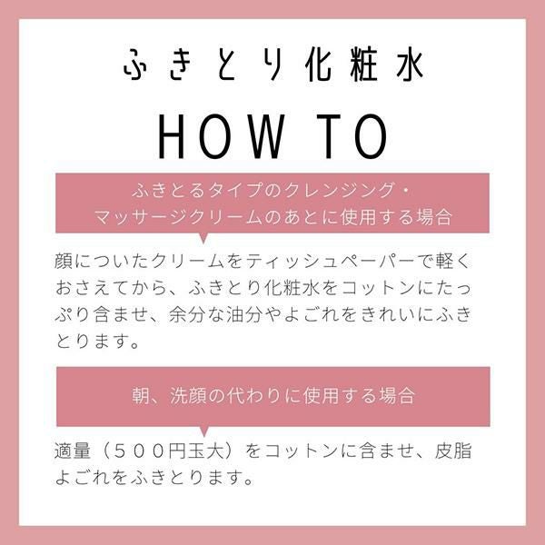●【ふきとり専用の化粧水】クレンジングやマッサージ後の余分な油分を溶かしながら落とす、拭き取り化粧水。肌に負担をかけずに、すっきりと拭き取れます。