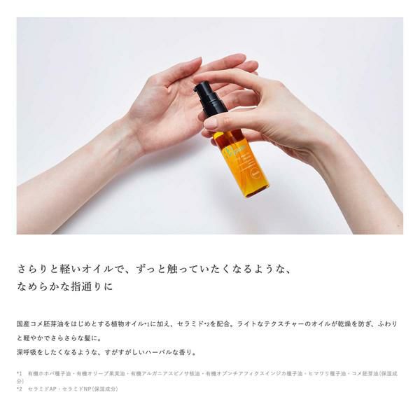 【スムース】ライトなテクスチャーのオイルが乾燥を防ぎ、ふわりと軽やかでさらさらな髪に。深呼吸をしたくなるような、すがすがしいハーバルな香り。