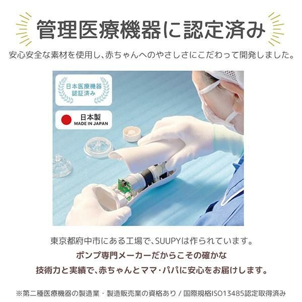 電動鼻吸い器「SUUPY」は、大手ベビー用品企業の依頼により、電動鼻水吸引器をこれまでに24万台以上製造提供してきましたTOKIO Labが、自ら培ってきた実績と経験を活かし、誕生した今までにない電動鼻吸い器です。 鼻吸い器のコア技術=ポンプという点から、独自の技術で真空ポンプ(クアトロポンプ)を開発・採用し、空気の通る穴(気筒)を4つにし、空気量を分散させることにより、携帯サイズで高い吸引力実現しました。
