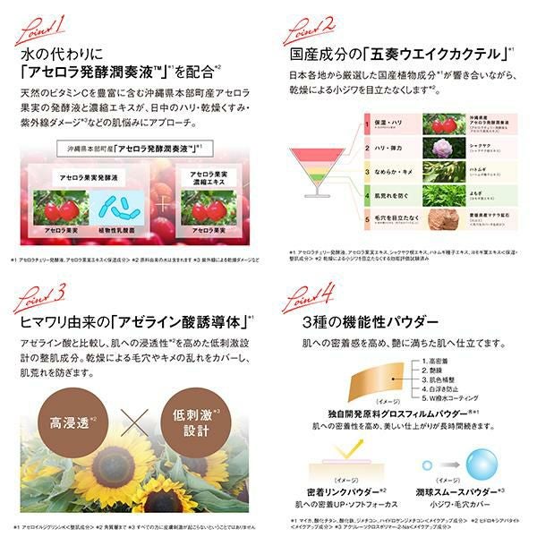*1 肌を大切にお手入れすること *2 アセロラチェリー発酵液、アセロラ果実エキス<保湿成分> *3 原料由来の水は含まれます *4 紫外線による乾燥ダメージなど *5 アセロラチェリー発酵液、アセロラ果実エキス、シャクヤク根エキス、ハトムギ種子エキス、ヨモギ葉エキス<保湿・整肌成分>、火山土<毛穴をカバーする成分> *6 アゼロイルジグリシンK<整肌成分> *7 乾燥による小ジワを目立たなくする効能評価試験済み *8 ヒドロキシアパタイト、アクリレーツクロスポリマー-2-Na、マイカ・酸化チタン・酸化鉄・ジメチコン・ハイドロゲンジメチコン<メイクアップ成分>