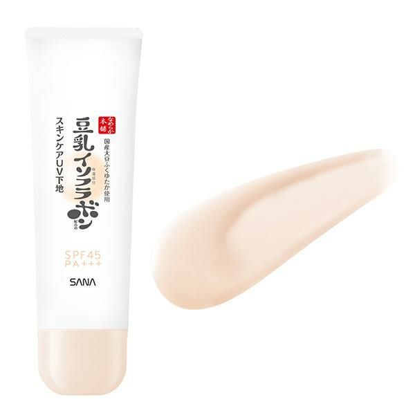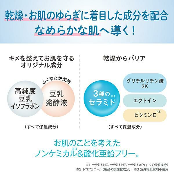 豆乳のスキンケアUV下地。低刺激&ノンケミカル※1。SPF45PA+++。酸化亜鉛フリー。※1:紫外線吸収材不使用。
