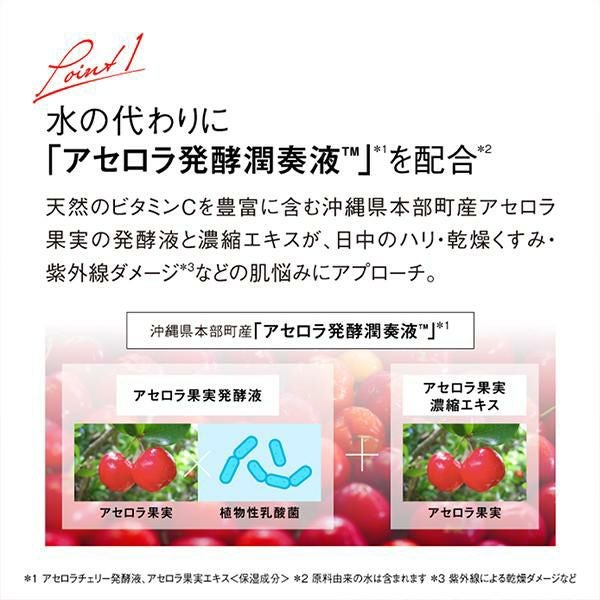 天然のビタミンCを豊富に含む沖縄県本部町産アセロラ果実の発酵液と濃縮エキスが、日中の保湿・ハリ・乾燥くすみ・紫外線ダメージ*5などさまざまな肌悩みにアプローチします。