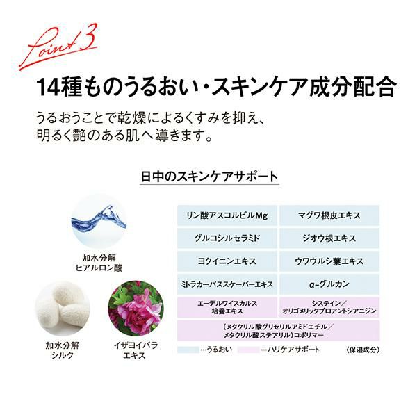 さらに、乾燥から肌を守る14種類のスキンケア成分を配合。長時間の美しいメイクをサポートします。