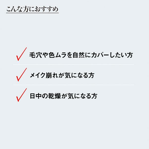 ホイップのようなクリームが滑らかに伸びて肌の上に極薄の透過フィルターをつくりだし、くすみ・色ムラ・毛穴や小ジワの凹凸などあらゆる肌ノイズを補整(*)。白浮きせずに、透明感のある滑らかな肌を演出します。