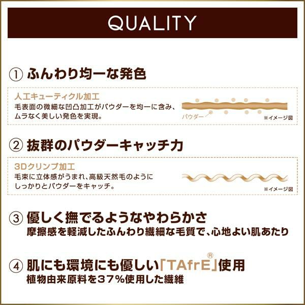 (2)抜群のパウダーキャッチ力「3Dクリンプ加工」毛束に立体感がうまれ、高級天然毛のようにしっかりとパウダーをキャッチ。