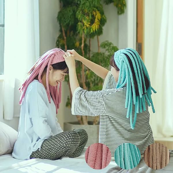 ●ヘアバンドにパスタのような線状(中空)のマイクロ素材を組み合わせ、被るとドレッドヘアのような形状に。乾かしにくい頭皮と毛髪の間の水をすばやく吸収してくれます。ヘアドライ時のストレスを楽しく解消!