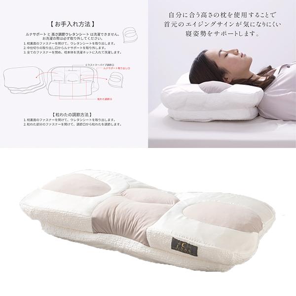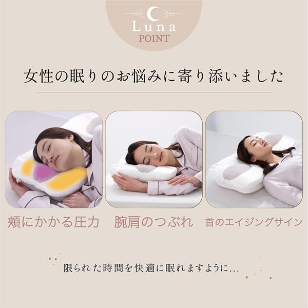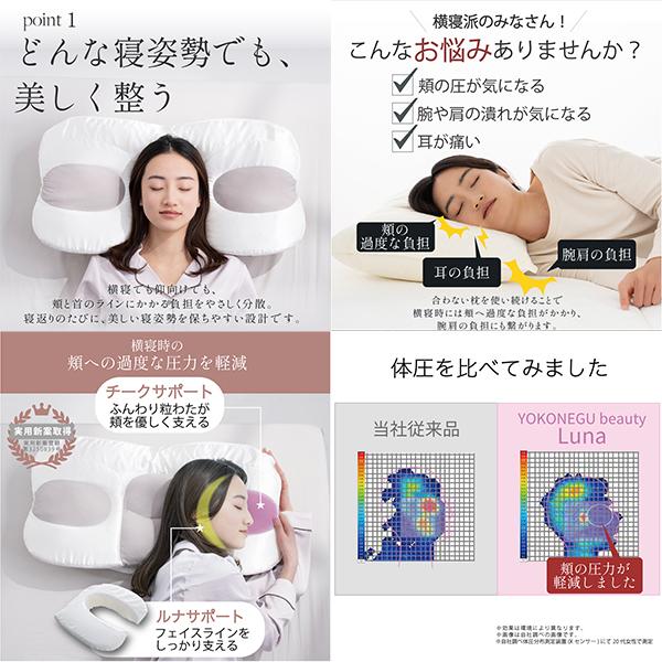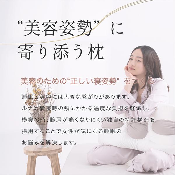 ルナは横寝時の頬にかかる過度な負担を軽減し、横寝の時、腕肩が痛くなりにくい独自の特許構造を採用することで女性が気になる睡眠のお悩みを解決します。