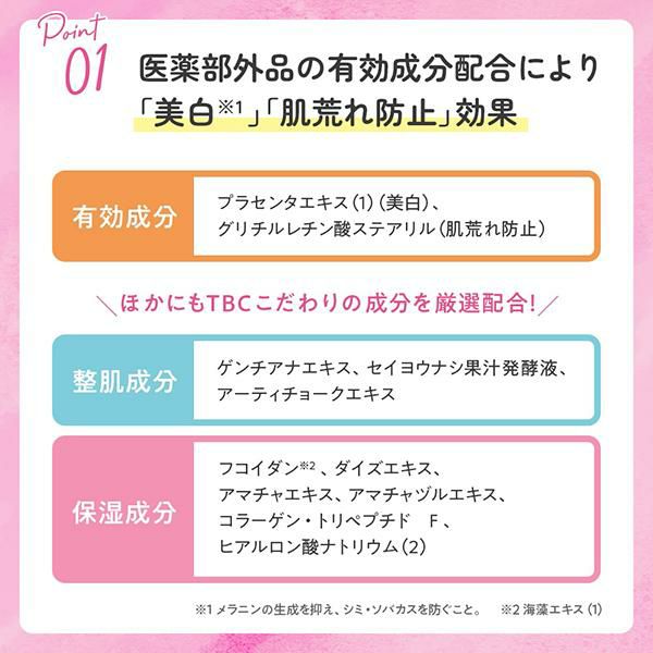 【美白※有効成分】プラセンタエキス(1)配合により、メラニンの生成を抑え、シミ・ソバカスを防ぎます。